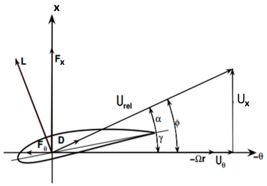 The geometric relationship among the local velocity, angle of attack and the aerodynamic force is depicted in Figure 1. , , are axial velocity, tangential velocity and rotation speed of the rotor respectively. The lift coefficient and drag coefficient are functions of the angle of attack . Once the relative velocity and aerodynamic coefficients are obtained through iterative calculation, the lift and drag force can be then expressed by Equations (9) and (10), respectively, where is the chord length and is the width of the airfoil segment.