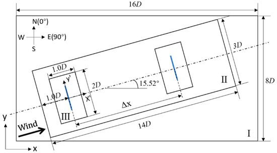 With the background mesh being the same as the Cartesian grids in precursor case, two refinement processes are imposed to the successor computational domain. According to the mesh resolution, the domain is divided into three regions, marked I, II, and III. Starting from ( represents the diameter of the turbine rotor) ahead of the first turbine to its downstream position in the wind direction and extending distance outward based on the hub center in lateral and vertical directions, Region II covers the wake flow of wind turbines with a mesh resolution of 4 m. Region III has the finest 2-m resolution, including the vicinity of each turbine rotor. The details of the wind farm layout and the scales of the computational domain are shown in Figure 2.