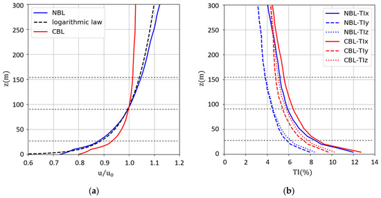 In Figure 3a, the blue and red solid lines represent respectively the velocity profiles in NBL and CBL. Theoretically, in the neutral situation the velocity distribution in the Prandtl layer, which should be no more than 100 m high, is subject to the following logarithmic law [35]: