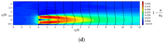 Figure 5 shows the time-average wake velocity deficit field in the hub height x-y plane and middle vertical x-z plane of both case 1 and case 5. Because the nacelle and tower of turbine are not simulated in the present study, the incoming wind flows past the rotor hub and forms a high-speed tube in the center of the near wake region. In Figure 5a,b, a similar wake evolution process is shown under both neutral and unstable conditions. The shear layer formed behind the blade tips and roots widens as it flows downstream, narrowing the high-speed tube until its disappearance at the onset of far wake region. This dividing point, however, locates at about downstream of the rotor in case 5, about one diameter ahead of that in case 1, meaning that the momentum exchange between the wake and ambient flow is more intensive in CBL. Moreover, the velocity deficit profiles in far wake region show perfect self-similarity and axial symmetry, which makes it reasonable to reproduce the profiles by a fitting curve and this technique will be used in the next part to define the wake center and edge. In Figure 5c,d, despite the wind shear to varying degrees in the vertical direction, the wake velocity distributions in different positions downstream are quite similar to those in the hub height plane in both cases. The only difference is that the expansion of the wake is blocked by the ground in far wake region, thus slowing the velocity recovery process near the ground.