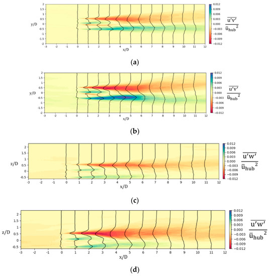 Reynolds stress contours and profiles. (a) at hub height x-y plane in NBL; (b) at hub height x-y plane in CBL; (c) at middle x-z plane in NBL; (d) at middle vertical x-z plane in CBL.