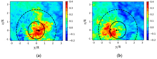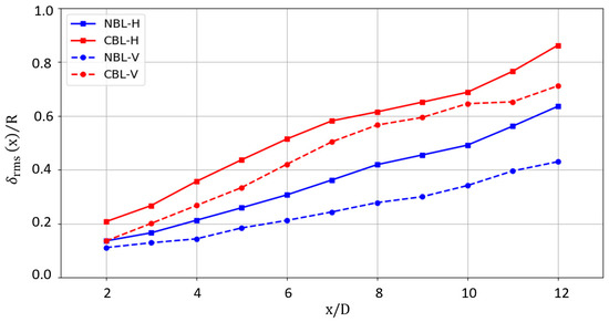 where and signify the wake center deflections in horizontal and vertical directions. Figure 10 shows the wake deflection RMS from to downstream positions. The results demonstrate that, despite the same turbulence intensity profiles in the y and z dimensions, the lateral wake oscillation is 10–50% larger than those in the vertical direction under both NBL and CBL conditions because the existence of the ground blocks, to some degree, the vertical movements of the wake and atmospheric turbulence. Moreover, it should be noted that the atmospheric instability remarkably intensifies the wake meandering, and especially the oscillation amplitude of vertical wake meandering under convective condition, is even higher than the lateral meandering in the neutral condition.
