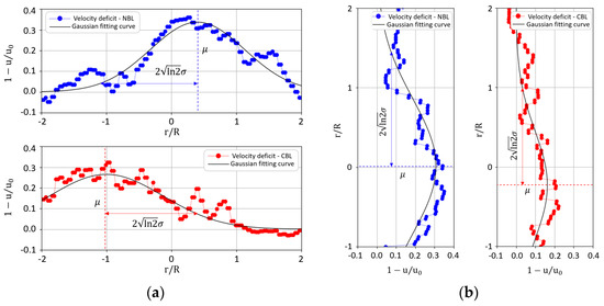 Temporally filtered velocity profiles and gaussian fitting curves at . Blue and red represent respectively NBL and CBL conditions. (a) Hub height x-y plane; (b) Middle x-z plane.