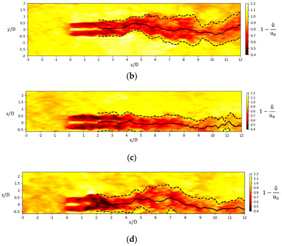 Temporally filtered instantaneous velocity deficit contours. (a) Hub height x-y plane in NBL; (b) Hub height plane in CBL; (c) Middle vertical plane in NBL; (d) Middle vertical plane in CBL.