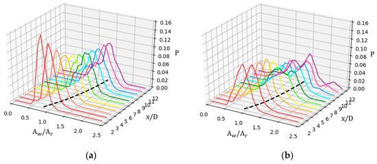 Probability density distribution (PDD) of the nondimensional wake area in different positions downstream, with the mean wake area plotted by black dashed line in x-y plane. (a) NBL; (b) CBL.