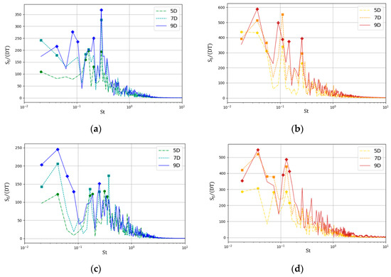 Nondimensional frequency spectrum of the 10-min wake deflection sequences at 5, 7, and 9 diameters downstream positions. (a) Horizontal direction in NBL; (b) Horizontal direction in CBL; (c) Vertical direction in NBL; (d) Vertical direction in CBL.