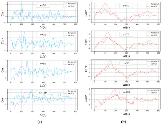 The results are displayed in Figure 13. From Figure 13a, under neutral atmosphere, the curves of correlation between characteristic inflow velocity and wake deflection show a distinct peak at . This proves that there is strong relation between the transverse inflow velocity and wake deflection in the corresponding direction and according to Equation (16), the time offset could be considered as the advection time of the inflow turbulent structure transported from (x-axis position of the inflow cross section) to . As the x-axis position of the wake cross section increases, the time offset corresponding to the peak increases because of the extension of the advection distance and the peak value of the correlation remains the same level until . Middle-scale oscillations (with periods of tens of seconds) can be observed in the correlation curves in horizontal direction, reflecting the existence of the vortex induced wake meandering, while in vertical direction, oscillations of similar scale are much weaker, which agrees well with the spectrum results in Figure 12a,c. In the last row of Figure 13a, though the peak in horizontal direction is still distinct, the peak value decreases apparently compared with those in the upstream positions, signifying the weakening of correlation. In Figure 13b, the correlation curves show distinctions from those in neutral condition. Firstly, stronger correlation between the inflow turbulent structures and the wake meandering can be confirmed in both directions according to the higher peak values. Secondly, only large-scale heaves are found in the correlation curves, meaning that the vortex-induced wake motion contributes little to the wake meandering under unstable atmosphere. In addition, the curves of horizontal and vertical directions show similar oscillation patterns, indicating the large-scale inflow structures dominate the wake movements in both directions. Moreover, even at position, the correlation between the inflow and wake meandering is still apparent. This implies that the Taylor hypothesis holds at a long distance, and thus the wake deflection at a certain turbine position can be predicted with accuracy using the upstream wake flow data.