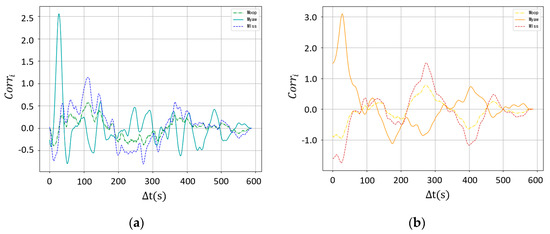 The subscript represents the three different aerodynamic moments. The wake deflection at position ahead of T2 is used. It should be mentioned that, for simplicity, only the horizontal wake deflection is considered in the correlation function. The resulting correlation curves are shown in Figure 14, from which a distinct peak for at is clearly seen. The time offset corresponds well to the advection time of the wake along the longitudinal distance. This proves that the yaw moment of downstream wind turbine is correlated with the horizontal wake meandering in both atmospheric conditions. When the wake wiggles horizontally, the rotor of T2 is partially shadowed by the wake and the asymmetry of its inflow is accentuated. In this case, the non-uniform x-axial aerodynamic thrust results in very large yaw moment. By contrast, the blade root moment and the low speed shaft moment are more sensitive to the instantaneous aerodynamic environment of every blade, which varies with the azimuthal positions when under inflow with strong wind shear and turbulence. Therefore, the relationship between the wake meandering and these two types of moments is masked by the high frequency fluctuation due to the rotation. Moreover, the correlation value for under a convective condition is higher than that in neutral condition, indicating the influence of wake meandering on the yaw moment of downstream wind turbine increases as the atmospheric boundary layer becomes unstable.