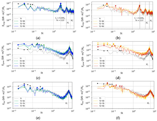 The spectrum analysis could better reveal the relationship between the wake meandering phenomenon and different types of structural loads. The power spectra of the three examined structural moments are plotted in Figure 16 and also the top five peaks of every curve are marked for clarity. In Figure 16a, the peaks of T1 (black pentagons) are mainly distributed in low frequency region, where the Strouhal number is lower than 0.1. However, for the downstream wind turbine, the dominant peaks are concentrated on , responding to the rotor revolution frequency . Other peaks of and (blade-passage frequency) are also distinct in the spectra of . This means that the wake effect under neutral condition mainly increases the fluctuation energy of corresponding to the rotor revolution and blade-passage frequencies. By contrast, in Figure 16b, the power spectrum density (PSD) of T2 at all frequencies is generally higher than that of T1. Figure 16c,d show quite similar energy distributions of in two atmospheric conditions. In the high-frequency region, only the peak of is detectable because yaw moment is induced by the ensemble of three blades. Different from the spectra of , the dominant peaks of yaw moments agrees well with the meandering frequencies, due to the strong correlation between and horizontal wiggles of the wake. Again, the shifting of the peak frequencies from in NBL to in CBL signifies the weakening of shedding-vortex-driven wake meandering with the decrease of atmospheric stability. Besides, the PSD of T2 is much larger than that for T1 and slowly declines as T2 is placed farther away from T1, which agrees well with the results in Figure 15. For the same reason, in high frequency region we can only see the peak corresponding to in the spectra of . The distribution curves of T1 and T2 in Figure 16e,f are nearly the same in the high frequency region where . Besides, in both cases, especially under convective condition, the dominant peaks of T1 are all distributed at the range where , indicating the fluctuation of T1 is mainly affected by relative large-scale flow structures. However, for downstream turbines, the peaks move rightwards, of which some frequencies are higher than the meandering frequencies. In fact, the torque of a turbine is related to the total energy flux in the rotor region. Therefore, it is not only sensible to the wake deflection but also the variation of the wake area shown in Figure 11, which accounts for the increase of fluctuation energy of .