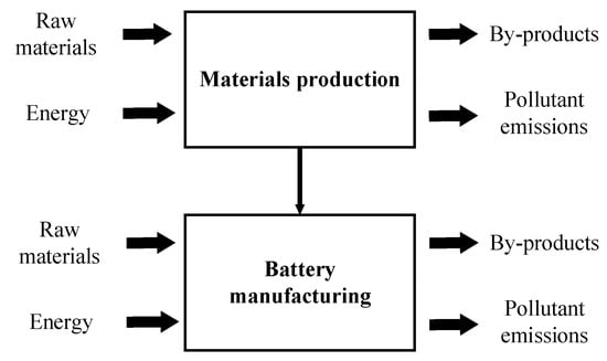 LCA is a kind of typical tool that can analyze the characteristics of a product, which can be used to research the whole life-cycle processes including raw materials production, manufacturing, use and final disposition. The International Organization for Standardization (ISO) states that LCA can be divided into four phases: Goal and scope definition, inventory analysis, impact assessment and interpretation []. As a bottom-up calculation method, LCA has been widely used in micro-analysis. With the wide use of LCA, a lot of software (e.g., SimaPro, Umberto) with various databases and calculation methods is developed around world. In this research, LCA was used to analyze the environmental impacts of different LIB products. The research boundary is from cradle to gate, which mainly contains the processes of materials production and battery manufacturing. In both processes, there are some input flows of raw materials and energy, and some by-products and pollutions are discharged in the production of target products, as shown in Figure 3.