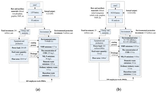 Two battery factories in China were chosen as the research cases and named case 1 and case 2. Case 1 produces 0.22 GWh LIBs each year whose main products are LFP batteries. The LFP battery is a kind of LIB whose positive active material is LiFePO4, while case 2 annually produces 0.024 GWh NCM batteries. The positive active material of NCM battery is Li (NixCoyMn1-x-y) O2. Major differences between the two batteries are cathode materials and the input ratio of battery components. Meanwhile, case 1 has 462 employees and covers the area of 32015 m2, while the case 2 has only 100 employees and covers the area of 1686 m2. Detailed situations of cases 1 and 2 are shown in Figure 4 to illustrate the 3E system of two factories vividly.