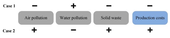 The results are shown in Figure 5. The “+” represents that the relative impact results for this case are greater than the other, while “−” stands for the opposite. It reveals that the four impact results for case 1 are 92.87%, 143.36%, 34.75% and 68.70% of case 2. Except for water pollution, most of the environmental impacts and costs are smaller for case 1, which shows that case 1 use energy more reasonably. As for water pollution, the number of employees required for unit battery production may be the biggest reason for the high emissions of NH3-N and COD in case 1, which also indicates that the environmental awareness of staff is not strong enough, while case 2 pays less attention to the solid waste, which cannot be disposed reasonably. Domestic waste accounts for 82%–83% of the total waste and is the major contributor to solid waste for two factories. Case 2 also spends more money on material costs, which is caused by the high prices of raw materials for the NCM battery. Therefore, there seems to be some scale effects between two factories from the view of 3E analysis. Scale expansion of factories may be one of ways of improving the environmental impacts and reducing the production costs for battery factories.