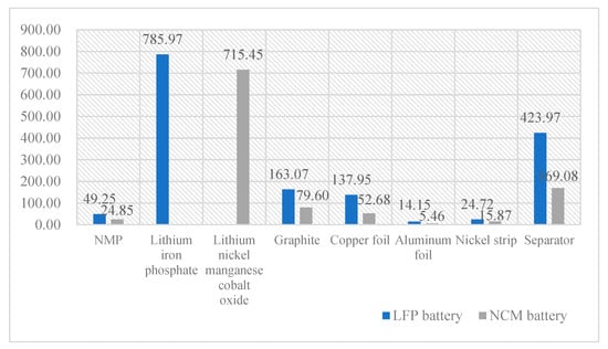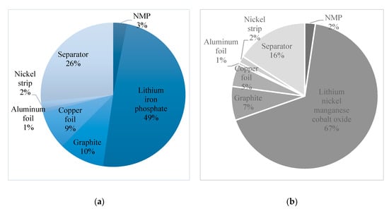 The total CF of raw materials production is 1599.08 and 894.57 kg CO2eq for case 1 and 2, respectively, when producing 1 GWh batteries. The CF of lithium compounds is extremely high compared to other materials for the two batteries, which is 785.97 and 715.45 kg CO2eq. Due to the scarcity of lithium as a resource, the acquisition of it requires greatly complicated processes with lots of GHG emissions. The CFs of separator and graphite are also higher than other materials because of the high consumption in actual production. The CF percentage charts were drawn to reveal the main contributory material for GHG emissions, as shown in Figure 8.