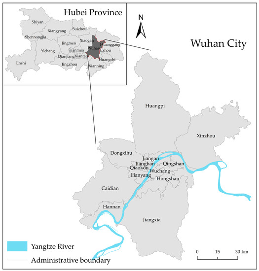 Wuhan, with a total area of 8574.9 km2, is the capital of Hubei Province, located in the eastern part of the Jianghan Plain. The Yangtze River, the third largest river in the world, and its largest tributary, Hanshui, runs through the city of Wuhan, dividing it into “three cities”, namely, Wuchang (comprising Wuchang District, Qingshan District, and Hongshan District), Hankou (comprising Jianghan District, Jiangan District, and Qiaokou District), and Hanyang (tHanyang District). The above seven central districts constitute the central region of Wuhan. Among them, Hanyang is the early industrial center; Hankou, which has a good industrial and commercial foundation, has developed into an economic and financial center of Wuhan; Wuchang mainly focuses on education and tourism [37]. Around the central city, there are seven suburban and rural districts: Huangpi District, Xinzhou District, Dongxihu District, Caidian District, Hannan District, and Jiangxia District (shown in Figure 1).