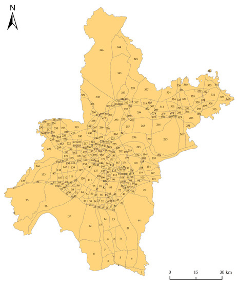 Block is the basic unit shaping residents’ life and urban environment, as well as the basic unit of urban morphological structure, urban function, urban administration, and urban cognition. In this paper, urban block is chosen as the basic spatial unit for identifying the stage of urban development, which not only breaks the boundaries between administrative divisions, but also fits well with the present situation that POI distributes along the road network. This approach is more accurate and objective in demonstrating the shape and scope of urban spatial layout than establishing a homogeneous and isotropic spatial grid. According to the method of dividing block units (discussed in Section 2.1), the municipality of Wuhan is divided into multiple blocks based on the road network. After discarding the blocks less than 0.6 square kilometers, 346 urban blocks are generated, as shown in Figure 4.