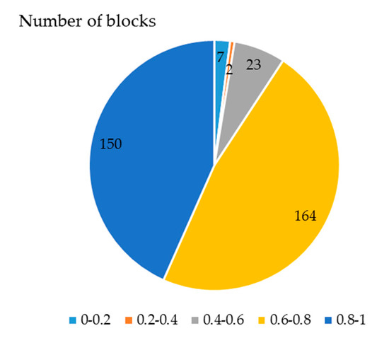 There are 15 categories of POI in the primary level, and each category has multiple secondary categories (as described in Section 3.1.3). The diversity index is to analyze the diversity of POI types in each block at different levels. According to Equation (2), the weight k is set to 0.7 in order to maximize the regional difference. The diversity index GM which has considered the weights of GM1 and GM2 was used to analyze the diversity of POIs in each block. The numbers of blocks in each section of GM are shown in Figure 5. Nearly 50% of the blocks have a GM in the 0.8–1 range, while only 10% of the blocks have a smaller GM in the 0–0.6 range.