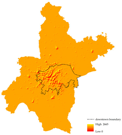 The main purpose of kernel density analysis was to study the spatial distribution of POIs, so this paper didn’t classify the POIs when performing kernel density analysis. Instead, kernel density analysis was carried out directly in ArcGIS, and the results were visualized to obtain the map of the spatial distribution of the number of POIs in Wuhan, as shown in Figure 6. In the kernel density analysis, since the number of the POIs in each region differs greatly, in order to display the distribution more comprehensively and accurately, the size of each grid cell was set to 10 and the search radius was set to 800. The results show that the kernel density of POIs is between 0 and 2665, and the average kernel density of the 346 blocks is between 0 and 1170. In Figure 6, locations with deep color and pockmarks have large POI kernel density and high spatial agglomeration of POIs. The visualization map can clearly demonstrate the characteristics of POI spatial distribution, one of which is that the POI concentration in the downtown area of Wuhan is much higher than that in the suburb.