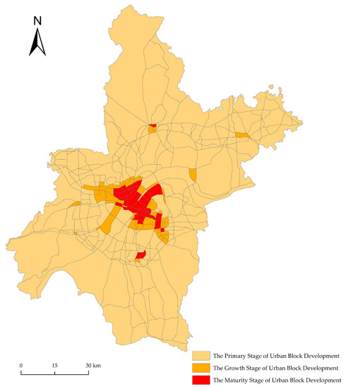 The numerical interval of UBDI is [0, 100]. The larger the value, the more developed the urban block. In this paper, the UBDIs of 346 blocks are classified in ArcGIS. In the “Natural Breaks (Jenks)” method, Natural Breaks classes are based on natural groupings inherent in the data. Class breaks are identified that best group similar values and that maximize the differences between classes. The features are divided into classes whose boundaries are set where there are relatively big differences in the data values [39]. The “Natural Breaks (Jenks)” method makes the variance between each class maximum and the variance within each class minimum. By using the classification method, UBDI is divided into three stages: the primary stage [0, 16], the growth stage (16, 47], and the maturity stage of urban block development (47, 100]. The urban development stages of the 346 blocks in Wuhan are shown in Figure 7.