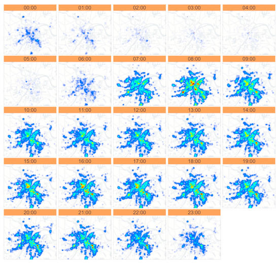 The distribution of urban micro-centers is mainly affected by population density, while the urban thermal map can reflect the most densely populated areas during each period. This paper extracts the population density of Wuhan at different time of the day according to the urban thermal map of Wuhan (Figure 8), then identifies the current distribution of urban micro-centers in Wuhan through the thermal map, as shown in Figure 9. Through the spatial distribution map, the development stages of the locations of these micro-centers are reviewed to verify the accuracy in the identification of urban development stage, and the blocks are identified which can be preferentially developed into urban micro-centers.