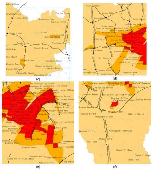 Street and block area overlay of Wuhan. (a) The street and block area overlay of Wuhan as a whole; (b) the street and block area overlay of Wuhan part I; (c) the street and block area overlay of Wuhan part II; (d) the street and block area overlay of Wuhan part III; (e) the street and block area overlay of Wuhan part IV; (f) the street and block area overlay of Wuhan part V.