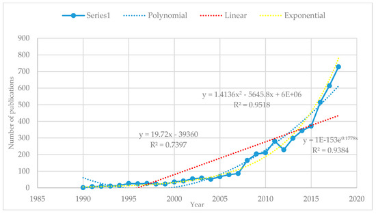 Different regression models were applied to find the linear, exponential, or polynomial models that best fit the data [30,57]: the independent variable is the years and the dependent variable are the number of publications. Table 1 illustrates the R2 calculated of each of the three regression models. It shows how, even though all three models are significant, it is the polynomial model which best fits the data set.