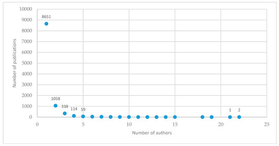 Lotka’s law posits that there is an unequal distribution of productivity among authors and that, regardless of the discipline; most authors publish the least number of works, while a few authors publish most of the relevant literature on a given topic, and they form the most prolific group. Figure 2 illustrates Lotka’s law, which shows the distribution of the number of publications per number of authors. While two authors have published 22 research papers each, the majority of authors (8651) have only written one in the field of sustainable tourism.