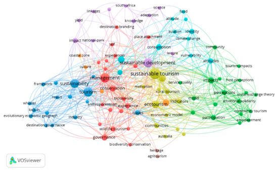 In this section of the article, a relational analysis is applied: the content co-word analysis, which assumes that groups of words reveal underlying themes [61]. The analysis uses the keywords of the journals that are in the nucleus, zone 1 and area 2 of Bradford identified in the previous section, where the debate and research in the area of sustainable tourism is concentrated. These journals, which lead scientific production, are the platform on which the conceptual structure of sustainable tourism research lines is defined; therefore, it is fundamental to know which topics are published more in these journals.