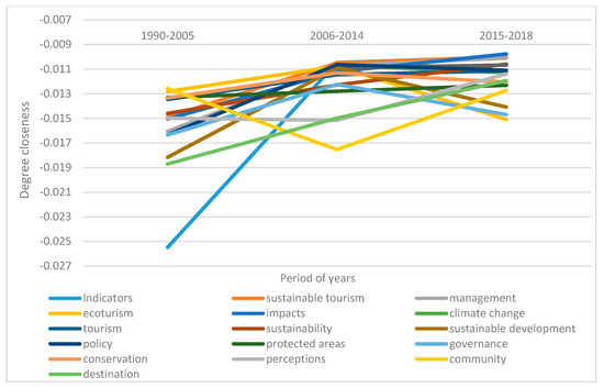 For each of the three periods analysed, using the keywords obtained from the previous process, the four parameters that will allow us to know the conceptual structure of sustainable tourism will be applied: hierarchy, proximity or clustering, centrality (closeness), and density [62]. This analysis will allow to approximate inductively the conceptual structure of sustainable tourism, observing the evolution of the field of knowledge throughout its existence.