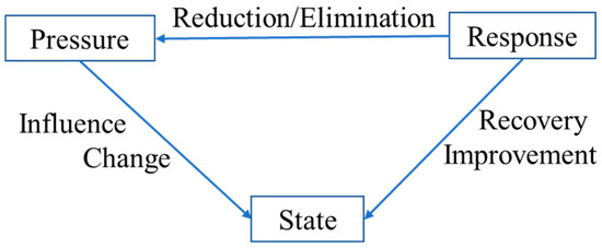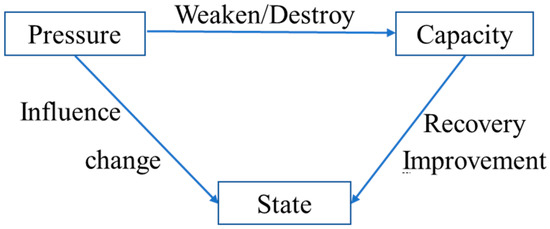 The pressure–state–response model was proposed by two statisticians in Canada in 1979 and has gradually developed into a framework for studying environmental issues [49]. This model reflects the causal relationship between human social activities and environment and composed of the pressure, state and response indices. Their relationship is shown in Figure 1. The pressure index reflects the impact of the bearing object on a carrier, such as the impact and influence of human social and economic activities on the environment. The state index reflects the state of a carrier at a certain time. The response indicator refers to measures taken by the government or individuals to mitigate, restore or prevent the negative impact of human activities on the environment. The stress–state–response model answers the three basic sustainable development questions of ‘what happened, why did it happen and how we will do’ from the perspective of causality. This model is widely used in the analysis and evaluation of carrying capacity. Yang [50] established the evaluation index system and grading standard of water-resource carrying capacity on the basis of the pressure–state–response model, as well as evaluated the water resource carrying capacity of the coastal areas in Liaoning Province. Wang [51] used the small towns in Xi’an as a research object, combined the features of the local natural environment and economic development level and used the pressure–state–response model to build an evaluation index system. The quantitative evaluation of the ecological security status of small towns reveals their geographic distribution and ecological security.
