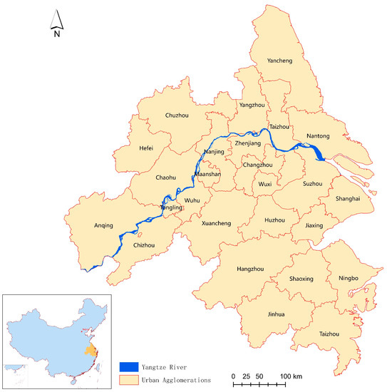 Urban agglomerations in the Yangtze River Delta, near the Yellow Sea and East Sea, are on an alluvial plain formed before the Yangtze River enters the sea. This area covers Shanghai and some cities in Jiangsu, Zhejiang and Anhui provinces (see location and scope in Figure 3). The area of the region is 21,1700 km2, which accounts for 2.2% of China’s land area. The total population reached 151.89 million in 2017, which comprises 10.93% of the country’s total population. The Yangtze River Delta is also an important intersection of the ‘One Belt and One Road’ and Yangtze River Economic Belt. Accordingly, this region plays an important role in China’s overall modernisation construction as a crucial platform of international competition, an important engine of economic and social development and the leader of the Yangtze River Economic Belt.