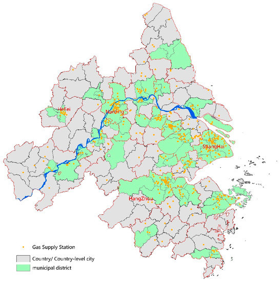 To promote energy transformation, China has implemented a series of policies and measures, such as replacing coal with gas and reducing coal consumption, which rapidly accelerate the consumption of oil and gas; China has become the world’s largest importer of crude oil and natural gas [43]. According to the latest development report of China’s energy and chemical industry in 2019, China’s natural gas industry can meet market demands; driven by the policy of replacing coal with natural gas, demand in some regions is growing faster than that of infrastructure [44]. However, many regions still lack a municipal gas pipe network because of the insufficient development of urban gas pipe network facilities; LNG, CNG and other gas supply methods are applied in this case, and they have developed rapidly and shown strong vitality [45]. However, operating these gas supply stations creates security risks and heightened competition in market application; furthermore, relevant regulations are not perfect, and charging license is unavailable [46]. With these factors, China is a suitable country for conducting such a study. Our results can help policy makers propose reasonable space planning, especially in regions with weak gas pipe networks. Our results can also contribute to the safety of residents. Expanding the natural gas consumption market is one of the major tasks indicated in China’s 13th five-year energy plan; the “coal to gas” project will be carried out in key cities such as the Beijing–Tianjin–Hebei region and its surrounding areas, the Yangtze River Delta, the Pearl river delta and northeast China [2]. The Yangtze River Delta is one of the regions with the strongest comprehensive economy, the most dynamic development and the highest degree of development in China; it is also one of the six largest urban groups in the world. Accelerating the regional integration development of the Yangtze River Delta is not only a general trend but also an internal demand. Data availability is also an important reason for us to choose this area as a case study.