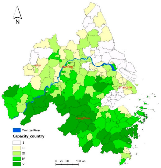 Evidently, the grades of bearing capacity are nearly divided by the Yangtze River. Moreover, the results of grade present a spatial pattern of ‘high in the south and low in the north’. That is, areas south of the line are in relatively higher bearing capacity grade than those in the north. The majority of the regions south of the Yangtze River are in Grade III or above. Meanwhile, all areas with a grade of V are located in the region, except for Yuexi country in Anhui Province. That is, the bearing capacity is medium or above in the majority of the districts south of the Yangtze River. Meanwhile, the majority of the northern areas are in Grade I or II, which means the bearing capacity is low.