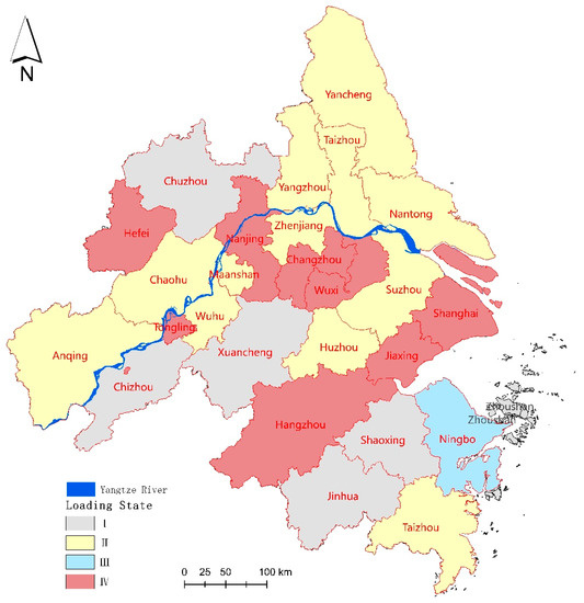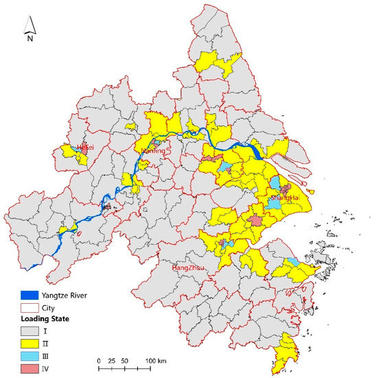 The bearing capacity and loading state indicate an obvious spatial difference and aggregation pattern. On a county scale, the bearing capacity grades of 203 subdistricts vary from county to county but present a trend of high in the south and low in the north, which is almost bounded by the Yangtze River. The loading state grades of the 203 subdistricts are almost in grade I and distributed in the south and north of the Yangtze River. This result indicates that the current state is low and will not affect the sustainability of the society. The loading state grades above grade I show an obvious distribution along the Yangtze River, and the overloading and suitable states occur in different counties in Shanghai, Nanjing, Hefei, Tongling, Changzhou, Wuxi, Jiaxing and Hangzhou, which are economically developed cities.