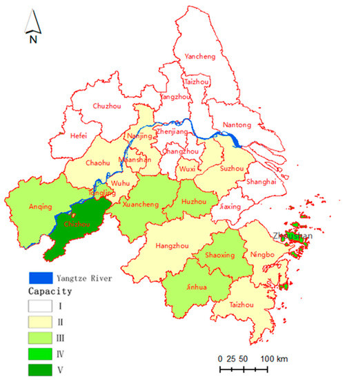On the city scale, 26 cities are located in the urban agglomerations in the Yangtze River Delta. The bearing capacity of each city can be feasibly calculated using Formula (3) when the bearing capacity of subdistricts has been determined. That is, the bearing capacity of a city is equal to the subdistricts’ minimum bearing capacity. Table 6 shows the results of the 23 cities. Figure 7 exhibits the results according to grade. Evidently, the spatial patterns of south high and north low are shown. The grades of urban bearing capacity are concentrated in Grades I, II and III. The bearing capacity of Chizhou, a city in Anhui Province, is in the highest grade (i.e., Grade V).