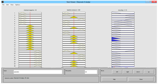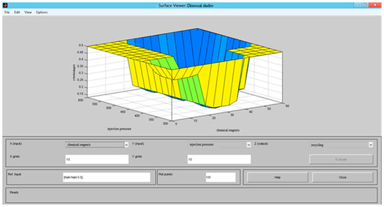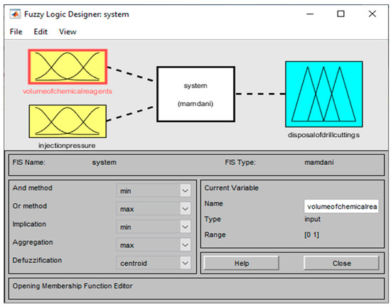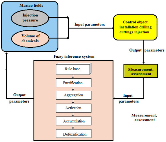 As can be seen from Figure 3, the input parameters for the control object, i.e., for the installation of injection of drill cuttings in a marine field are the values of the injection pressure and chemical reagents volume and the output parameter of the installation is an indicator of the utilization of drill cuttings. Since these parameters are difficult to quantify quantitatively, it is advisable to evaluate their values using expert evaluation (in the measurement, evaluation block). Then, the fuzzy output system receives fuzzy values of the estimated input parameters, and the fuzzy value of the percentage of utilization is obtained from the output of the system. Depending on the output value of the fuzzy inference system and the rule base control actions are generated.