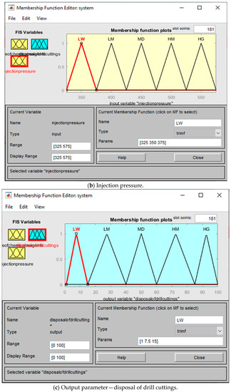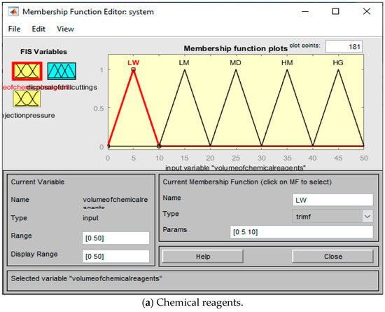 Table 1 and Table 2 show the 5 levels of values of fuzzy parameters (HG-High; HM-High of medium; MD-Medium: LM-Low of medium: LW-Low), i.e., values of linguistic variables, and Figure 4 shows 3 linguistic parameters (volume of chemical reagents), (injection pressure), and (disposal of drill cuttings).