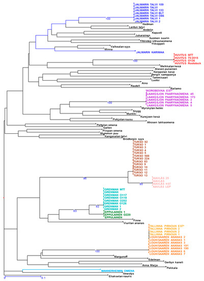 In the years 2002–2005, the Finnish apple collection consisted of 242 accessions: of which 54 are of Finnish origin, 95 Russian, 32 North-American, 22 Scandinavian, 16 Baltic, seven Central European and two Japanese [4]. The group of 54 apple varieties (or accessions) of Finnish origin consisted of 16 Finnish bred cultivars; 38 accessions were categorized as “unknown seedling from Finland”, i.e., Finnish seed-born local varieties. From the Finnish apple collection, young leaves were sampled for the purpose of the microsatellite genetic analyses while fruits were used for morphological identification of varieties.