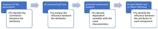 We used the attributes identified as having similarities through PCA, to analyse if those attributes are homogeneous and have the same distribution (a null hypothesis), using a Kruskal–Wallis test [,]. If the null hypothesis (H0) is rejected (p-value < 0.05), we can conclude that the attributes are heterogeneous.