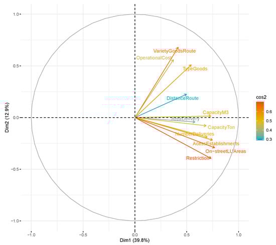 Figure 5 shows the correlation circle between the attributes and the principal component, illustrating the eigenvalue ordered from the highest value for each component (called dimension in the plot). In this Figure, the attributes are also positively correlated, because they are grouped together. Further, the commonality (cos2) represents the quality of the attributes’ representations. We observe that, in general, all attributes are representative (a warmer colour defines the most representative attribute), except for “distance in a route” and “area of delivery” (represented by the blue color).