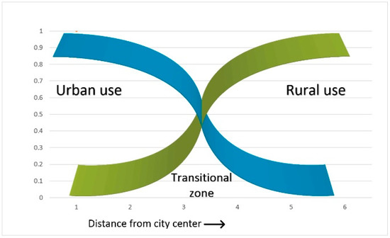 For spatial analyses, it is necessary to define and locate the existing functions in space, especially those at the junction of the urban and rural areas. For practical considerations, it is easier to define and specify the spatial range of urban use because of the distinct forms of space use, which are expressed by, inter alia, the degree of urbanisation. According to the fuzzy set theory, the waning urban space will be complemented by rural space. In order to determine whether the area under study performs the assumed functions, one can apply the fuzzy logic and determine the degree of membership of the urban or rural forms of the space use. If the fuzzy measure for urban use is 0.9, then it is 0.1 for rural use, which means that the space is definitely more urban than rural, and it can be defined as urban. The basic operations on fuzzy sets indicate that after the degree of membership of urban use of space is determined, the fuzzy set will be complemented by rural use [75]. It is proposed that the area whose degree of urban and rural use are similar, and which cannot be assigned to either of the functions, should be called a transitional zone. The transitional zone is formed in the area of intersection of the fuzzy measures determined for the urban and rural use of the space (Figure 4).