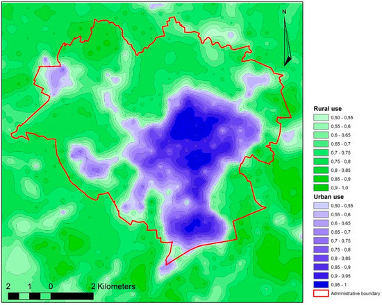 The fuzzy models of urban and rural use, and those typical of a transitional zone, were verified in the last study phase against the existing state of space development and put on topographic maps of the study area, which is shown in the illustrations: Figure 10—urban use in the degree of membership interval of [0.50,1.00], Figure 11—border between urban and rural use in the membership degree of 0.5.