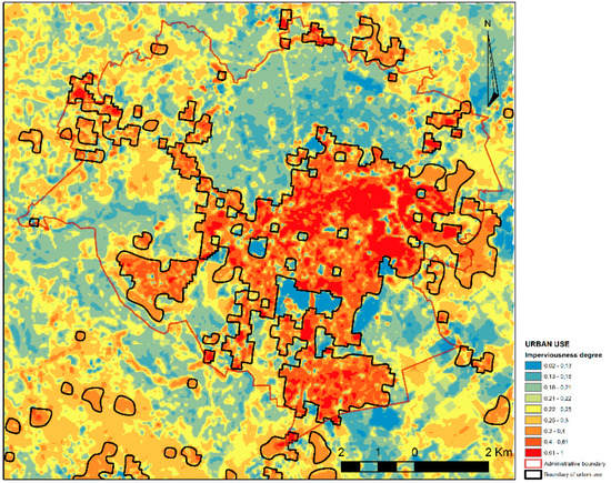 Urbanisation refers to the complex interaction of different processes which transform landscapes formed by rural lifestyles into urban like ones. Urbanisation causes profound changes in the ecological functioning of the landscape and gradually results in a changing spatial structure [72]. The presence of various forms of spatial use on a small area and the relationships between them impart a special character to the transitional zone between urban and rural areas. Studies of the physiognomy of the transitional zone show that its nature is mainly decided by such forms of spatial use present on a small area as sparse multi-family housing development and single-family housing development, buildings under construction, areas for recreation, garden plots, orchards, greenery, agricultural area, and the town development thresholds, which prevents its further spatial development [55,75]. In that situation, a much more important question becomes, if according to existing data like CLC and HRL, does fuzzy set theory allow us to identify borders of the transitional zone in a more precise manner?