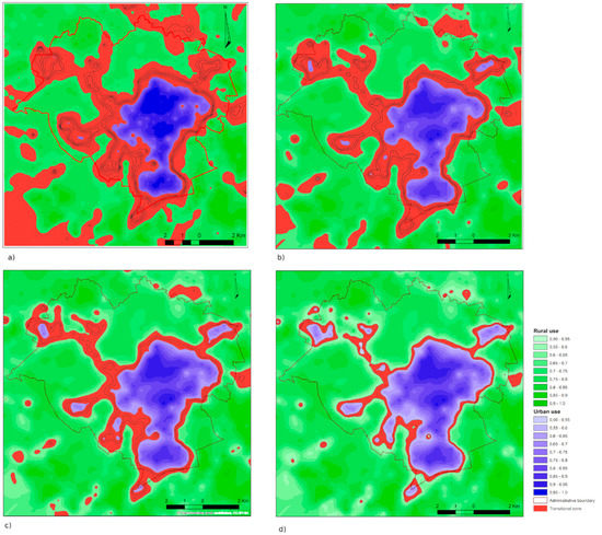 When determining the borders of urban and rural investment, one can delimit the spatial range and degree of membership of the transitional zone around the town under study. The space thus formed, which cannot be assigned to either of the functions, is present only at places where the method of use is considerably affected by both urban and rural use. An analysis of the course and shape of the function of membership determined for the study area yielded an interval of membership, for which the study area cannot be definitely assigned to the urban or the rural use. The transitional zone thus formed has been determined for four variants in the following intervals of the membership function: Figure 9a: μ = [0.30,0.50], 9b: μ = [0.35,0.50], 9c: μ = [0.40,0.50], 9d: μ = [0.45,0.50].