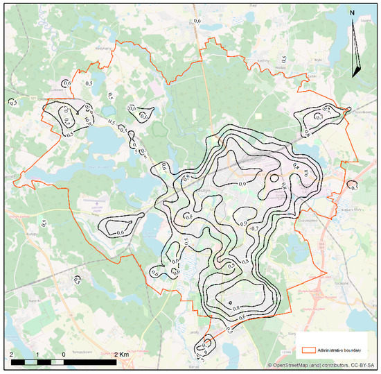 Data from the stock-taking and the degrees of membership of the urban land use, determined as the product of these values (the degree of a field’s membership of the city was calculated as the product of the percentage of a particular land use form in the area of the field and the degree of membership from Table 1) enabled the development of a fuzzy model of the city and the village within the study area. The results were used to develop a fuzzy town and country model, which is shown—with the administrative border, main roads, the railway line, and lakes—in Figure 5. For the interpolation of the obtained values, the kriging method was applied in the developed models. Kriging is the basic method of geostatic estimation, which was originally used to estimate gold in Africa. The general rule of kriging as the basic geostatic method is that there is a relationship between the distance separating points and the degree of their similarity. As well using this method, we can predict the value of a function at a given point by computing a weighted average of the known values of adjacent point. The parameters of this function are determined in an experimental way that the deviation of empirical from the theoretical values should be as small as possible. In our research, we used the ordinary kriging, which is the most popular method. We want to show a map of spatial variability of urban and rural areas, for which the best values in terms of the obtained model matching errors were obtained.
