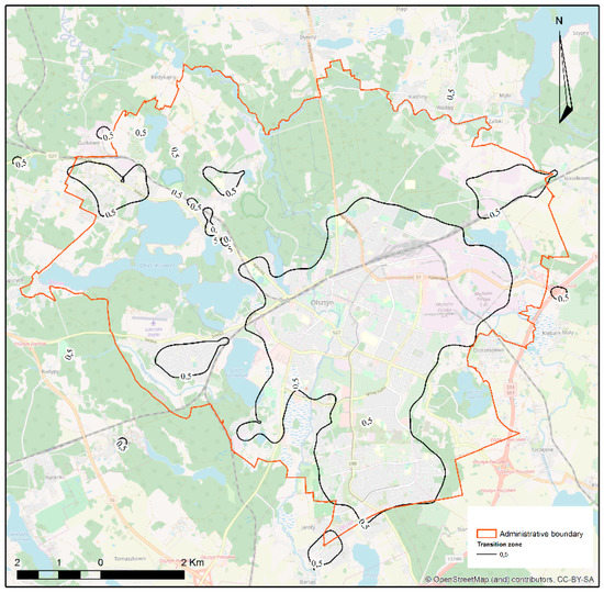The outer border of the transitional zone does not coincide with the administrative border of the town. The zone also includes areas administered by the neighbouring communes: Stawiguda, Purda, Barczewo, Dywity, and Jonkowo. The maximum width of the transitional zone around Olsztyn, with the membership degree of [0.3,0.5] is about 3.5 km, with its width in the narrowest place reaching 0.5 km. The maximum area of the transitional zone around the urban area is 45.022386 km2, which means that there are 346 study fields with a method of use that cannot be clearly identified as urban or rural areas. Use that is typical of a transitional zone appears also in the northern and southern parts of the area under study as separate enclaves. It is the result of suburbanisation and new housing development appearing in the suburban zone.