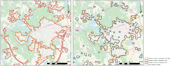 The obtained results make it possible to conclude that fuzzy logic, defined as a technique used to define and present indefinite, uncertain information, can be successfully used to identify and determine the extent of the transitional zone between city and village, and to conduct studies and analyses of land use structures occurring in such areas. Additionally, the determined boundaries of the range of urban use, prepared by the developed method using the assumptions of fuzzy set theory and based on Corine land cover (CLC) and high-resolution layer (HRL) data, were compared to one another, as shown in Figure 12.