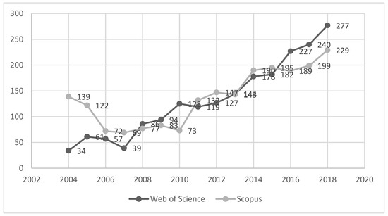 The importance of effectiveness of marketing communication in the online environment is also multiplied by the number of scientific publications dealing with this issue in the renowned databases, namely, Web of Science (1990) and Scopus (2059), for the period from 2004 to 2018 (Figure 1). However, it should be noted that the number of scientific articles and studies includes all synonyms of online marketing, i.e., digital marketing, internet marketing, and e-marketing.