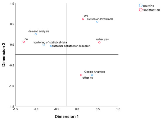 A significance level was determined at 0.05 and corresponded to a 95% confidence interval. Based on the comparison of the significance level with the P-value (Asymptotic Significance), the null hypothesis was rejected and we can confirm an alternative hypothesis, so there is a statistical dependence between the variables examined (types of metrics to assess the effectiveness of online marketing activities of hotels and their sufficient level). The intensity of the interdependence of variables by the Cramer’s V measure of association (0.260) indicates low dependence. Based on the existence of dependence between the variables, it makes sense to examine the internal structure of the contingency table by the correspondence analysis. The results are shown in Figure 3.