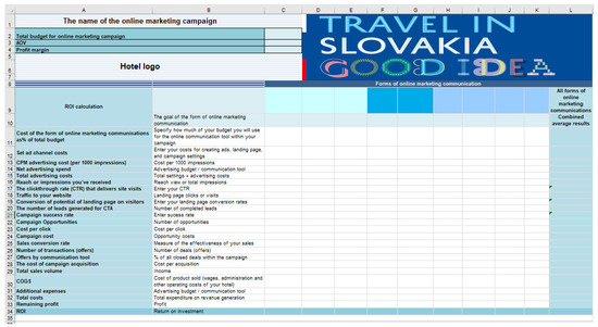 The first part of the ROI calculation of the online marketing campaign contains information about the name of the online marketing campaign, respectively, about the goal that the evaluated forms of online marketing communication should achieve. In addition, the hotel management needs to fill in the data about the total budget for the online marketing campaign (cell C2), the average order value (AOV) (average amount of value generated by each online activity by an average customer (cell C3)), and the profit margin expressed as a percentage of a hotel´s profit from sales of its products and services (cell C4). Among other things, hotels can insert their own logo in this calculation, which will be placed to the left of the wording “Travel in Slovakia Good Idea” (a project funded by the European Union for the promotion of tourism in the Slovak Republic and the brand Slovakia). The second part of the ROI calculation concerns the determination of the various forms of online marketing communication that are identified by a hotel´s management (line 9, columns C to L). In line 10, management will indicate the specific goal of each form of online marketing communication used. Inserting the input and output characteristics of selected forms of online marketing communication, including their numerical data, relates to the calculation of ROI for individual selected forms of online marketing communication overall. Column A (ROI calculation) lists the names of input and output characteristics, which were selected on the basis of several professional foreign studies dealing with the issue of online marketing communication effectiveness [30,43,46,47,50,56,59,76]. In addition, in the column B, the user can identify the specific input and output characteristics of the forms of online marketing communication. The columns C to L (quantity depends on the number of the forms of online marketing communication used) contain numerical values of each input and output characteristic, including the relationships needed to quantify the ROI of these communication tools and overall.