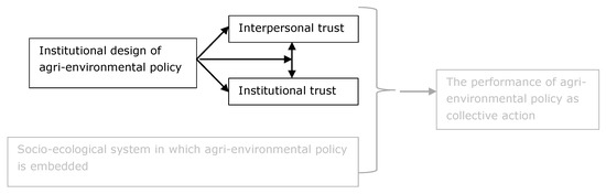 From our theoretical exploration, it follows that trust is a concept with a strong multi-dimensional character, in which interpersonal trust is highly dynamic under the influence of new experiences, altered expectations, and contextual changes, while institutional trust is less dynamic and relates to the design and performance of institutions. However, both types of trust are interrelated in complex ways as trust is experienced on different levels and in different contexts may contribute to either trust in institutions or interpersonal trust as well as their interrelation. For studying trust and the performance of agri-environmental policies as collective action, we have to look at institutional design and performance, and how these impact interpersonal and institutional trust and their interrelation. In doing so, we must take into account the wider socio-ecological context in which agri-environmental policies are embedded (see Figure 1).